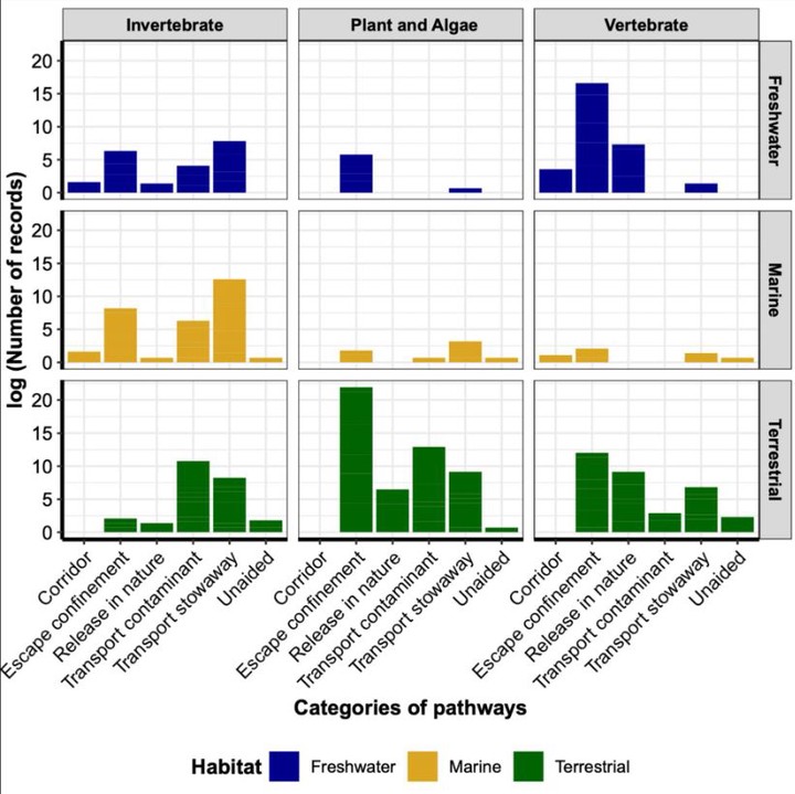 Managing pathways of species introductions is key to improve prevention, and predict the arrival of new species. We conducted a pathways assessment for invasive non-native species in Brazil considering three classes of species: (a) invasive non-native species already present; (b) contained: species introduced in Brazil with a history of invasion elsewhere, but so far not occurring in natural areas; and (c) absent from Brazil: species of potential introduction risk due to commercial relations with other countries, or close to country borders. We used a list of invasive and potentially invasive species compiled for Brazil as the basis of our assessment, with 238 plants and algae, and 319 animals, totalling 557 species. We conducted an online validation process with 126 professionals of government agencies, research agencies, universities, NGOs, and private companies. The pathways/vectors assessment using the classification adopted by the Convention on Biological Diversity resulted in 700 pathways/vectors for 319 invasive non-native animal species, and 596 for 238 plant species, totalling 1296 pathways/vectors for 557 species. In aquatic habitats, ballast water and hull fouling are the prevalent pathways for invertebrates, plants and algae, while the ornamental fish trade, aquaculture, and sport fishing are the main pathways for aquatic vertebrates. In terrestrial habitats, invertebrates arrive from unintentional introductions, vertebrates are introduced intentionally, and plants are primarily introduced intentionally for ornamental purposes, shade, or other cultivation. The main pathways are a priority for policy development and for the prevention or interruption of species transits. Recommendations are provided to guide governance and policy development.