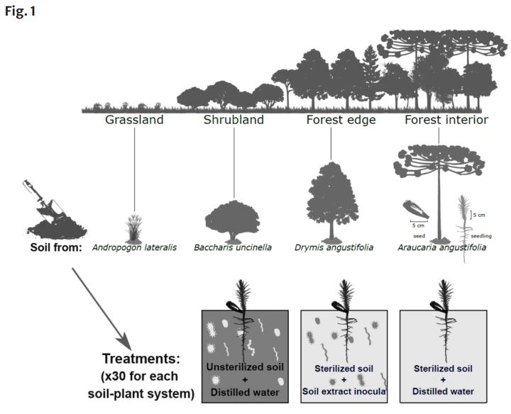 Seed germination and seedling growth are often limited by extreme abiotic conditions and negative biotic interactions, while facilitation can enhance early plant performance. These positive interactions may be mediated by soil microbial communities (SMC), adding a key component to vegetation dynamics. We evaluated SMC effects from a grassland-forest gradient on the performance of Araucaria angustifolia, a critically endangered tree that acts as a nurse species in forest expansion over grasslands. We expected beneficial effects from SMC associated with adult Araucaria and forest soils. In a microcosm experiment, we tested germination and early growth of A. angustifolia in soils from grassland, shrubland, forest edge, and forest interior. For each soil type, microbial communities were manipulated using three treatments: (1) live soil with intact microbiota (unsterilized), (2) sterile soil with microbial communities removed (autoclaved), and (3) inoculated soil, where a microbial wash was reintroduced into sterile soil.Contrary to our expectations, SMC from all soil types had neutral effects on germination but negative effects on seedling performance. These net negative effects were consistent across the grassland-forest gradient. Seedling growth was lowest in forest interior soils, where adult Araucaria trees are abundant and highest in sterilized soils. Overall, SMC reduced A. angustifolia seedling performance. While this may favour the persistence of grasslands, it also suggests that the slow pace of forest expansion over grasslands may be mediated by belowground biotic interactions. Our results highlight the importance of SMC in shaping vegetation dynamics and succession in subtropical highland ecosystems.